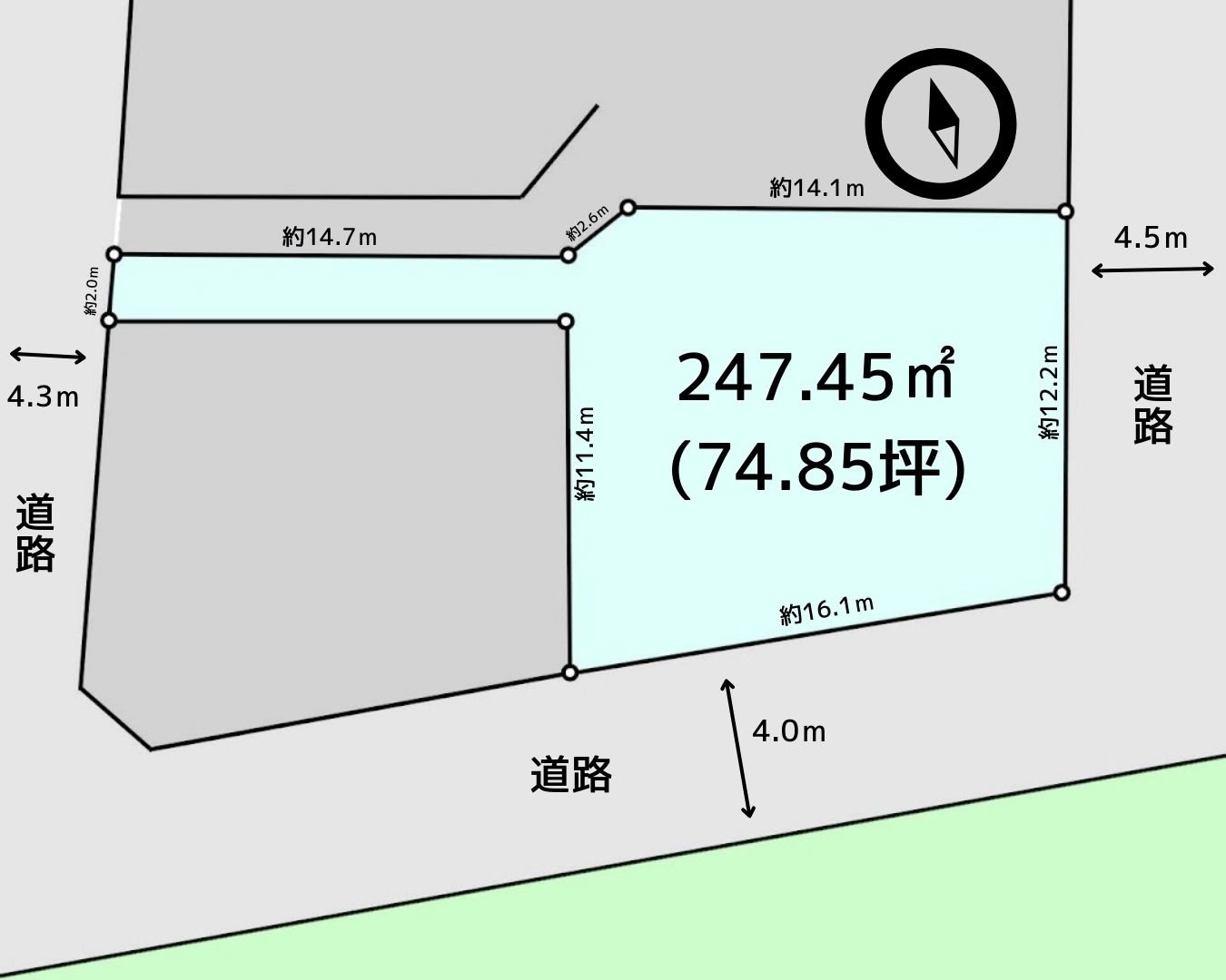 - 角地:三方道路 南4.0m 接面16.0m 東4.5m 接面12.0m 西4.3m 接面2.0m